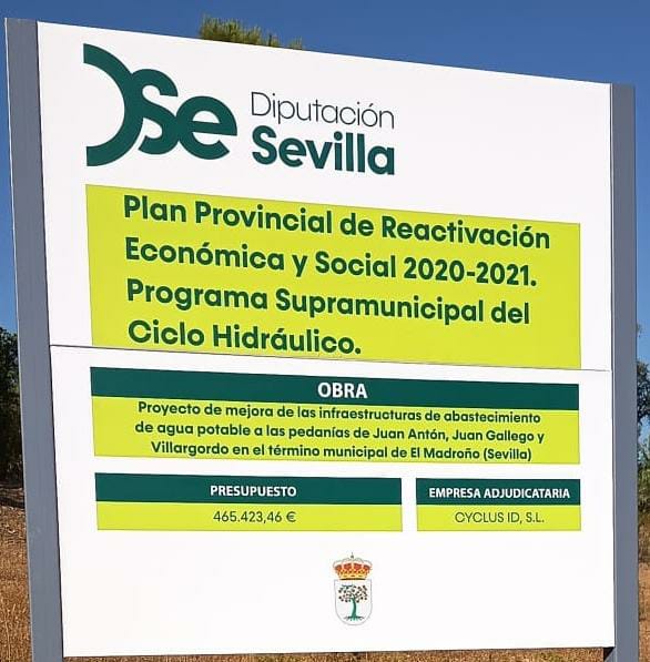 El proyecto, además del nuevo deposito de 450 m3 para agua potable y una nueva sala de bombeo mejorará las infraestructuras de abastecimiento de agua potable a tres pedanías de “El Madroño” en la provincia de Sevilla